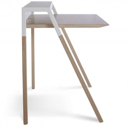 A cantilevered profile sets the stage for some hard work, or for some serious social networking. The desk top is a warm walnut veneer that matches the solid legs. Choice of grey or red steel accents.
