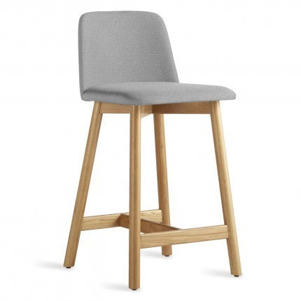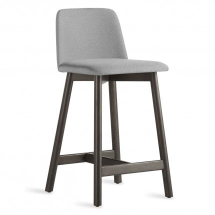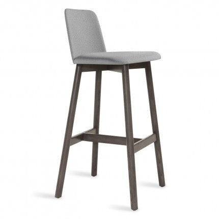 Solid ash with smoke stain, or solid white oak legs. Foam wrapped wood seat covered with polyester fabric coverings available in pewter, gun metal, purple and bright green.