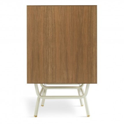 Perforated steel door front allows use of remotes without spoiling the view. Brass details and powder-coated steel base. Available in risk-averse grey, white and walnut.