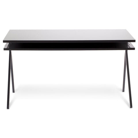 Powder-coated steel frame with lacquered wood top. Features a slide out keyboard tray. Available in red, grey, ivory and white.
