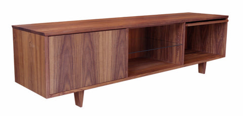 Standard sizing 20h x 18d x 72l. The unit as shown, in walnut, contains a section with drawers, a section with a self storing door, and one glass shelf.