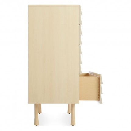 Overlapping wood drawer and door fronts give the collection its name, while the white washed maple finish and a scene stealing leg bring the visual charisma. With four soft close drawers. Three leg finish options available.