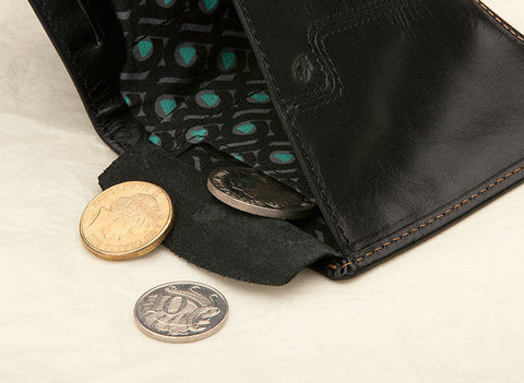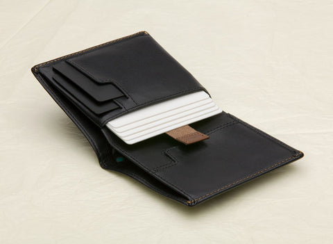 The Note Sleeve Wallet by Bellroy is made from premium vegetable tanned leather.  It features 3 quick access card slots and a pull tab for less used cards, fitting 8.  It also features a full size note section to store bills flat and a small coin pocket.