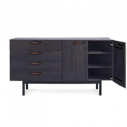 The Shale collection features clean details, solid wood construction and full grain leather pulls. For the bedroom, living room or anywhere in the modern home. Door units feature adjustable shelves and wire management holes.
