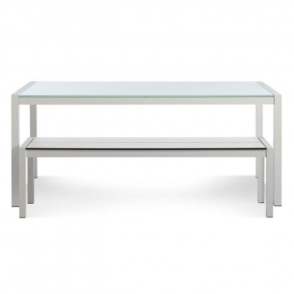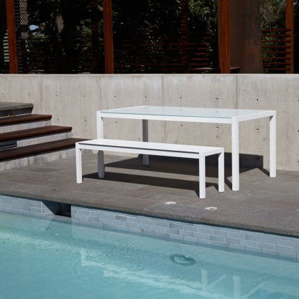 Crisp minimal white powder-coated aluminum and tempered sandblasted glass. Clean lines designed to weather the elements. Available in rectangle or square.