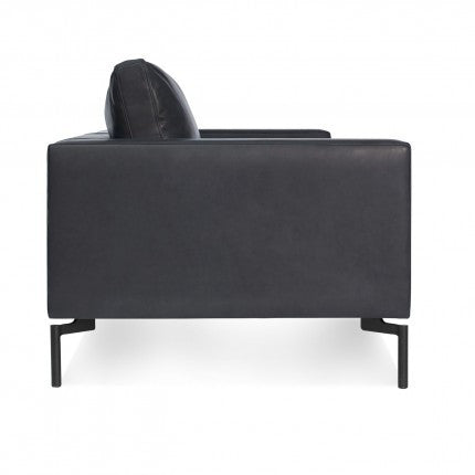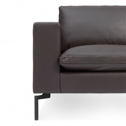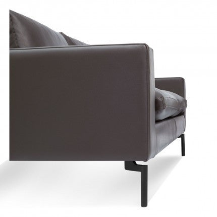 The New Standard is simplicity at its best with a twist. Wide arms and inviting loose cushions all come together with tuned proportions and show stopping legs. Now Available in durable and sumptuous leather upholstery options. Choose from dark brown leather or granite leather with black legs.