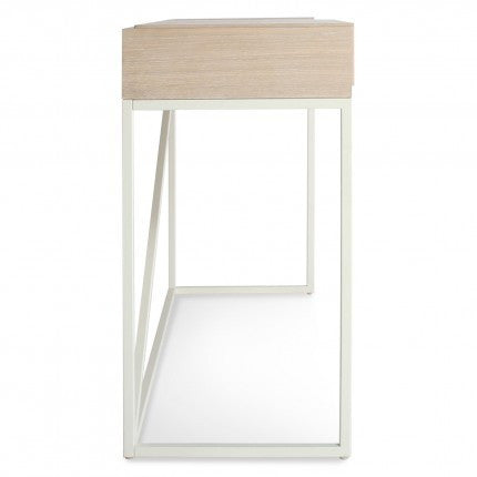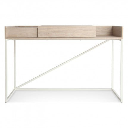 Sliding top to conceal or reveal more work space. Pencil and/or junk drawer. Cord management slot. Matt powder-coated steel base in slate or white. Available in a white-washed ash or walnut veneer top.