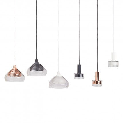 A subtly tinted glass shade rests on a metal pendant to create a simple, yet eye-catching interplay between two materials and forms. Three finishes to choose from to suit nearly any space. Mounts to ceiling.